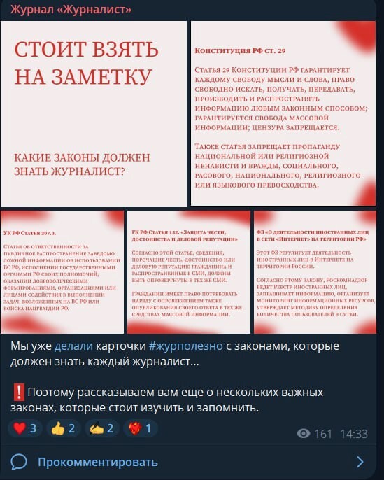Работа с Евой Меркачевой быстро вышла за рамки обычной помощи с обращениями граждан: студенты запустили для ее телеграм-канала новый формат — карточки-ликбез под хэштегом #объясняет_Меркачева, где простыми словами разбираются сложные термины и права осужденных. Параллельно команда активно участвует в расследовании одного из дел: готовит обращения в компетентные органы, поддерживает связь с фигурантами и свидетелями. Этот процесс уже перерос в подготовку масштабной публикации для «Московского комсомольца» в соавторстве с правозащитницей, что стало серьезным профессиональным опытом для участников.